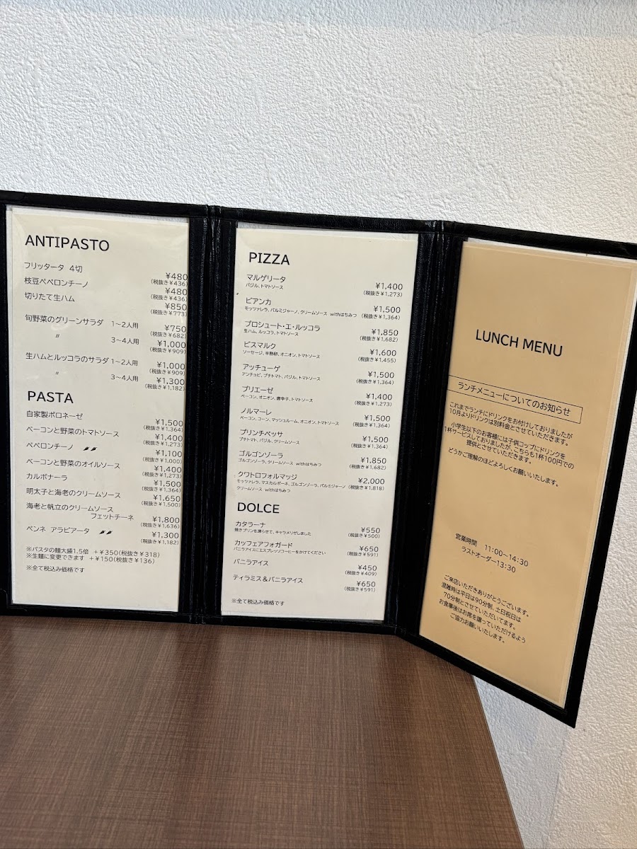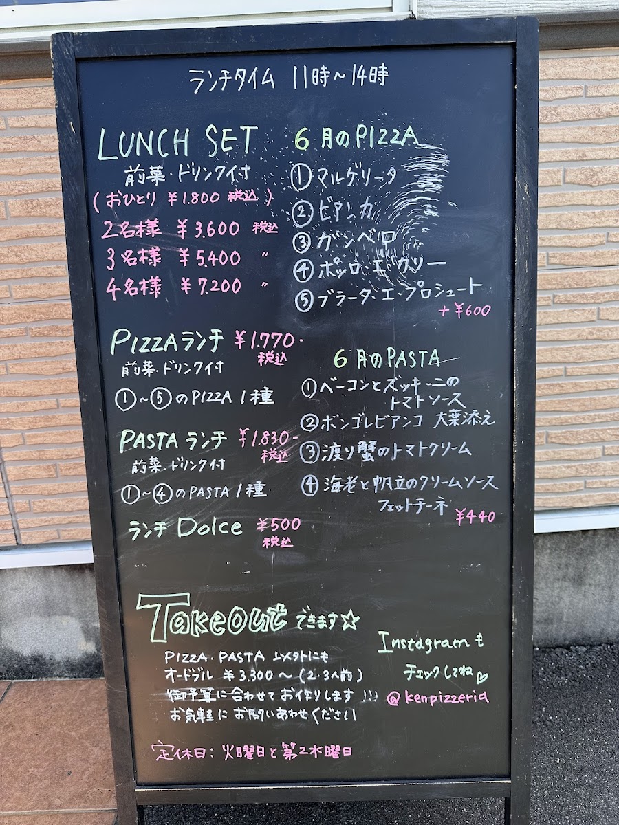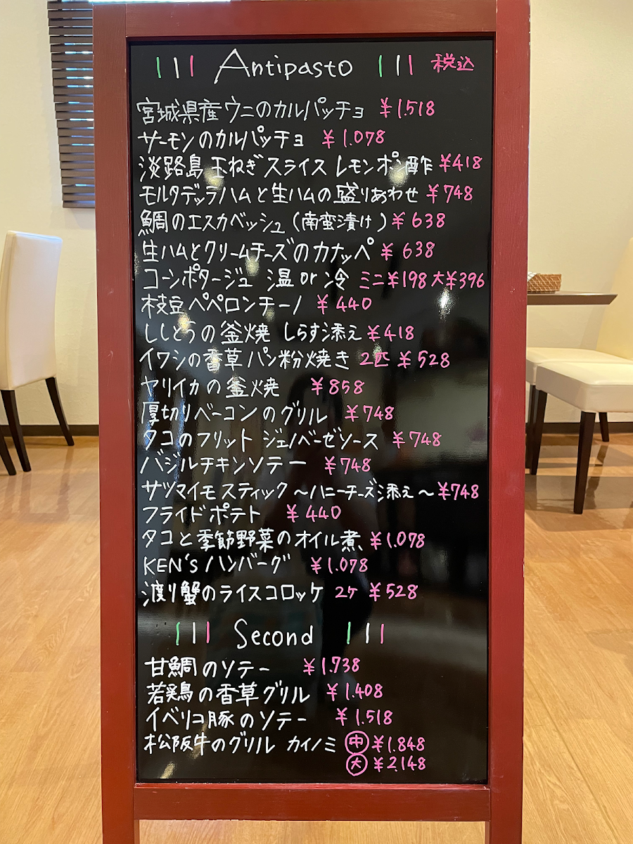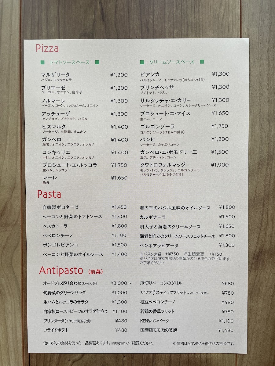 The menu at Pizzeria Ken offers a delightful selection of both classic and innovative dishes that are sure to satisfy a variety of tastes. Start with the hearty 前菜キッシュコーン スープ, a warm, comforting choice that perfectly prepares the palate. For pizza lovers, the マルゲリータ ピッツァ is a must-try, featuring a traditional, well-balanced topping of tomato, mozzarella, and fresh basil. The プロシュート is a deliciously simple yet refined option, perfect for those who enjoy the delicate flavor of cured ham. For something with a bit more flair, the 海の幸バジル風味ピスタチオ brings together seafood, basil, and pistachios in a creative and flavorful combination.